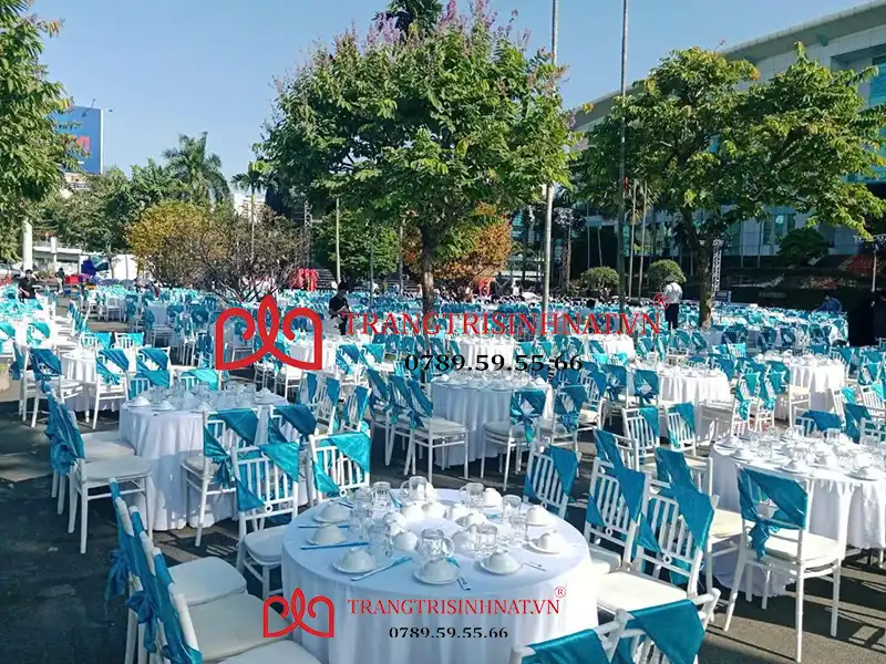 Bàn ghế: Ghế Banquet, ghế inox, ghế nhựa, bàn dài IBM, bàn bar, bàn tròn tất cả được bao áo và nơ ghế.